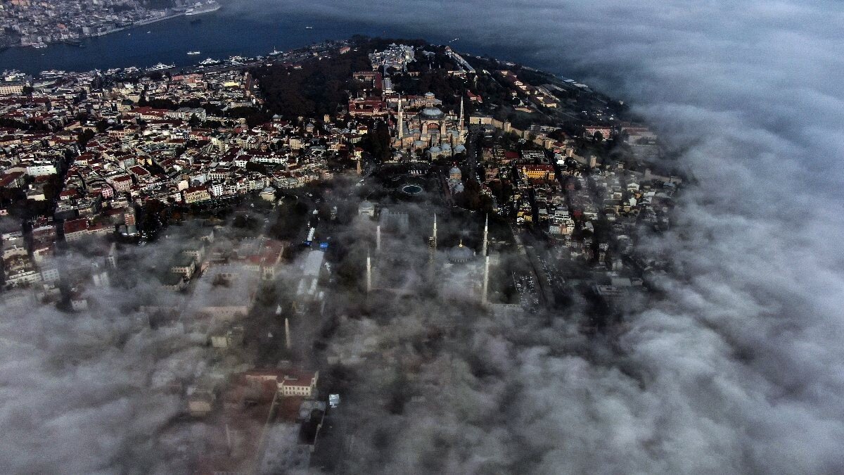Ayasofya-i Kebir Cami-i Şerifi ve Sultanahmet Camii sis bulutu altında adeta kayboldu.