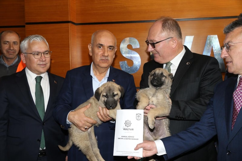 Sivas Belediyesi’ni de ziyaret eden Bakan Kirişci’ye burada dişi ve erkek olmak üzere 2 Kangal köpeği yavrusu hediye edildi.