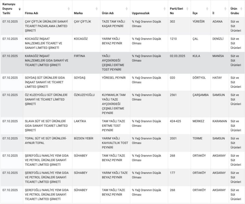 Denetimler derinleştikçe sağlığı tehlikeye düşüren gıdaların sayısı artmaya devam ediyor. Tarım ve Orman Bakanlığı'nın güncellediği taklit ve tağşiş listesine göre 22 süt ürününün yağ oranında uygunsuzluk olduğu tespit edildi.