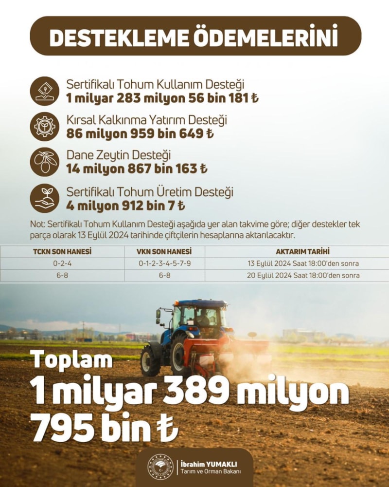 Tarım ve Orman Bakanı İbrahim Yumaklı, toplam 1 milyar 389 milyon 795 bin lira tarımsal destekleme ödemesini çiftçilerin hesaplarına aktaracaklarını duyurdu.