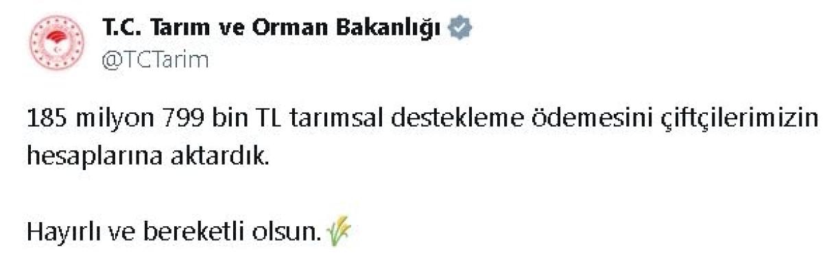 Bakanlığın sosyal medya hesabından yapılan açıklamada, 94 milyon 111 bin lira Hayvan Hastalıkları Tazminatı Desteği, 45 milyon 321 bin lira Kırsal Kalkınma Yatırımları Desteği, 37 milyon 525 bin lira Bireysel Sulama Sistemlerinin Desteklenmesi, 7 milyon 871 bin lira Sertifikalı Tohum Üretim Desteği, 417 bin 435 lira Sertifikalı Tohum Kullanım Desteği, 222 bin 400 lira Hayvan Gen Kaynakları Desteği ve 331 bin 165 lira İyi Tarım Uygulamaları Desteği olmak üzere toplam 185 milyon 799 bin lira tarımsal destekleme ödemesinin çiftçilerin hesaplarına aktarıldığı belirtildi.