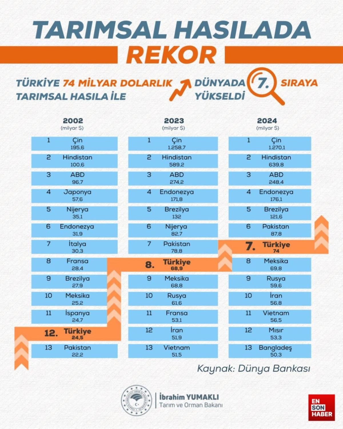 Son verilere göre 2024'te ise bir rekor kırılarak 74 milyar dolarlık tarımsal hasıla ile Türkiye 7. sıraya yükseldi.