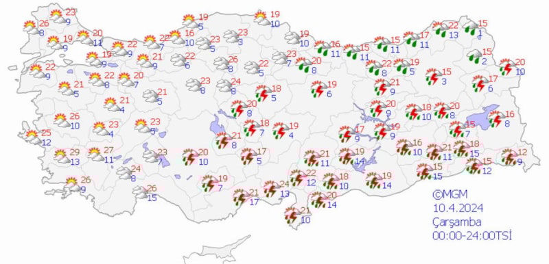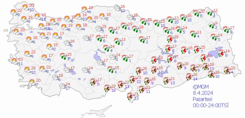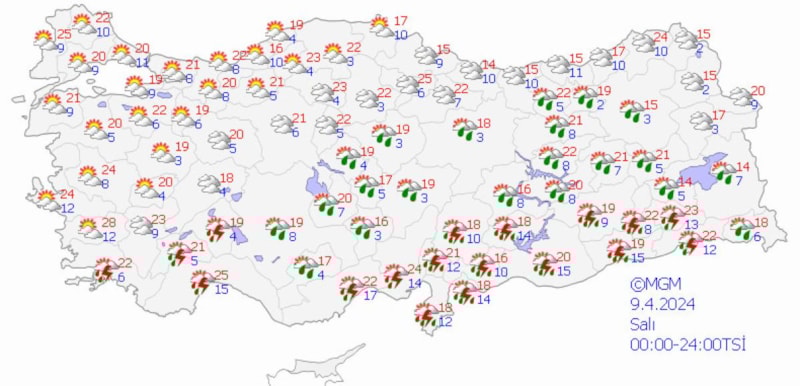 Yapılan son değerlendirmelere göre; ülke genelinin parçalı yer yer çok bulutlu, İç Ege'nin doğusu, Doğu Akdeniz ve Antalya'nın iç kesimleri, İç Anadolu’nun güney ve doğusu, (Artvin hariç) Orta ve Doğu Karadeniz, (Iğdır, Ardahan dışında) Doğu ve Güneydoğu Anadolu'nun sağanak ve gök gürültülü sağanak yağışlı geçeceği, yağışların İç Anadolu'nun doğusu ve Doğu Anadolu'nun doğusundaki yüksek kesimlerde karla karışık yağmur ve yer yer kar şeklinde görüleceği tahmin ediliyor.