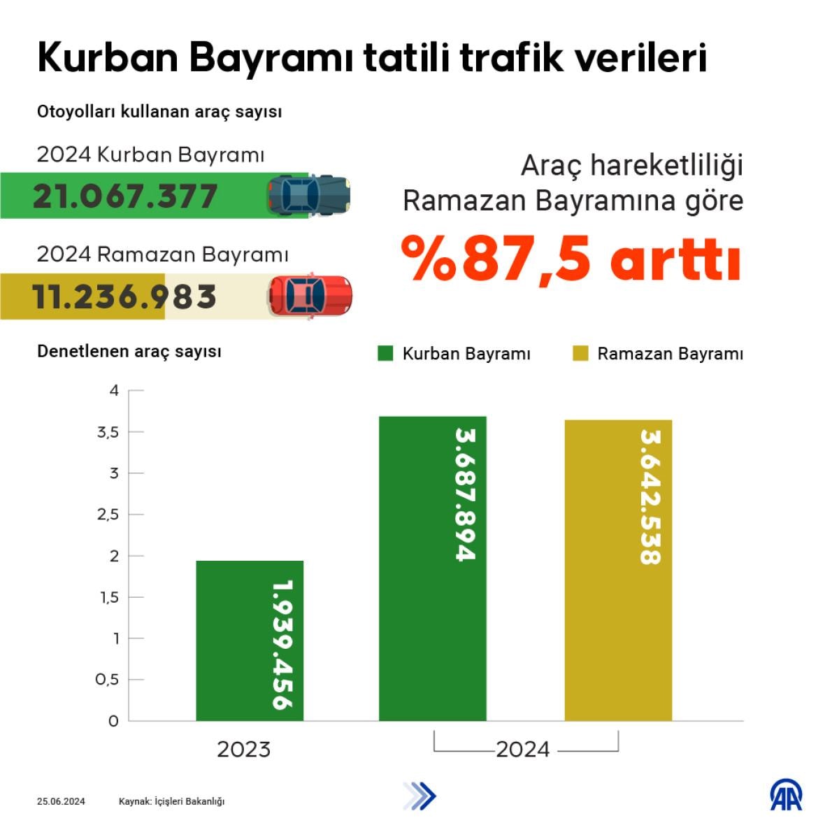 2024 Kurban Bayramı tatilinde 3 milyon 687 bin 894 araç denetlendi. 519 bin 242 işlem yapıldı. Polis ve jandarma, yolcuları emniyet kemeri konusunda uyardı.