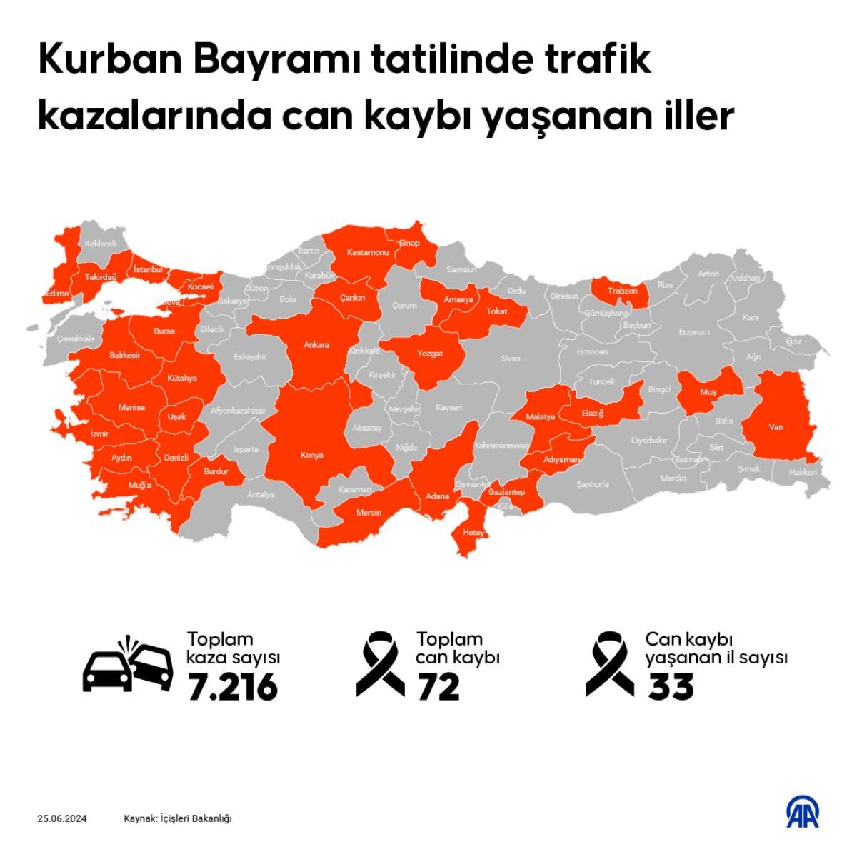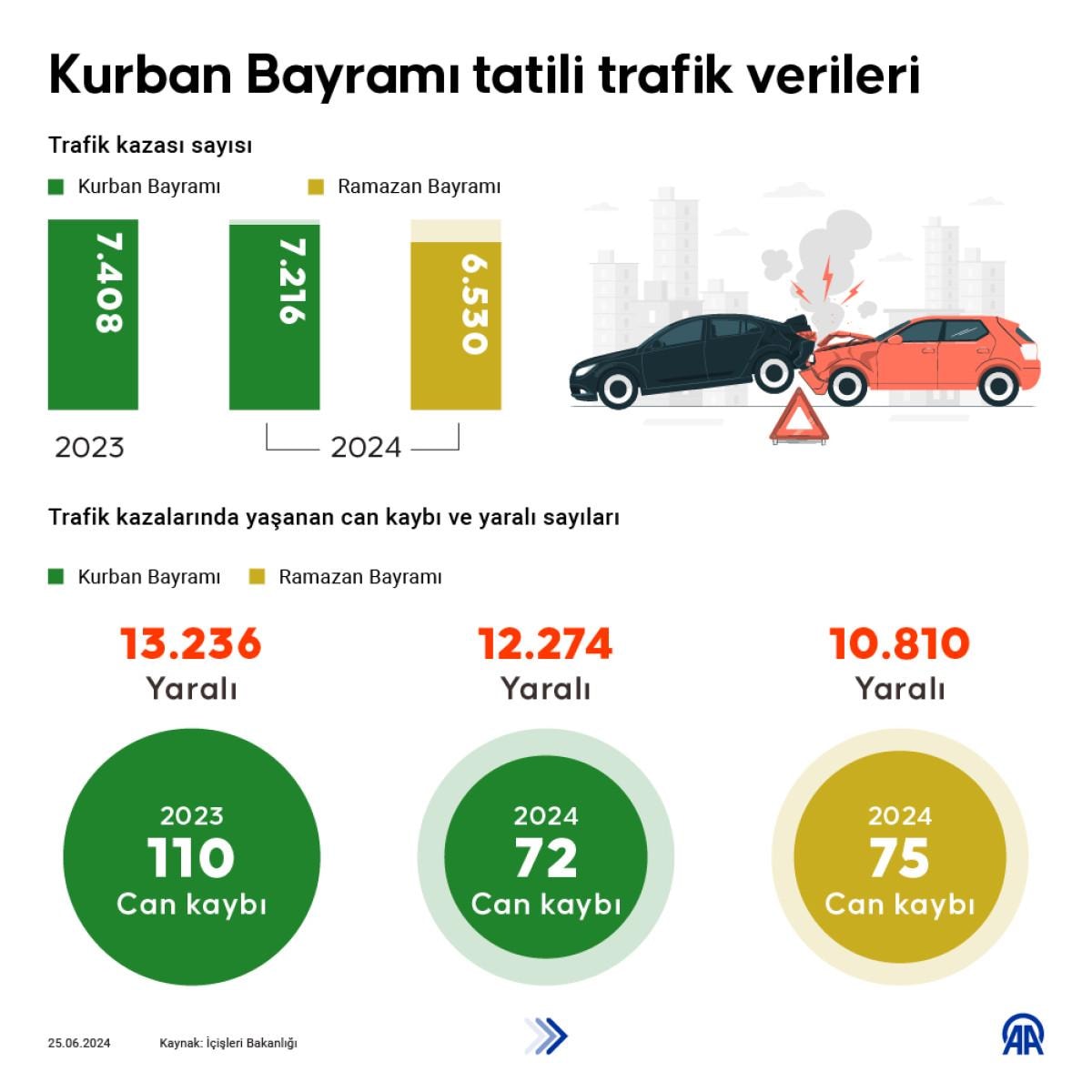 İçişleri Bakanlığı verilerine göre; 7 bin 216 trafik kazası meydana geldi.
