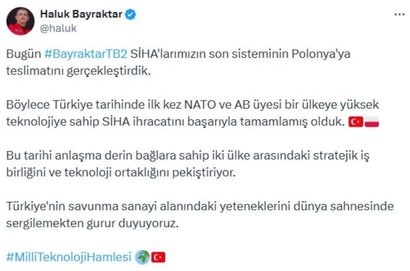 BAYKAR Genel Müdürü Haluk Bayraktar, Türkiye'de yerli ve milli imkanlarla üretilen Bayraktar TB2 SİHA'nın son sisteminin Polonya'ya teslim edildiğini duyurdu.
