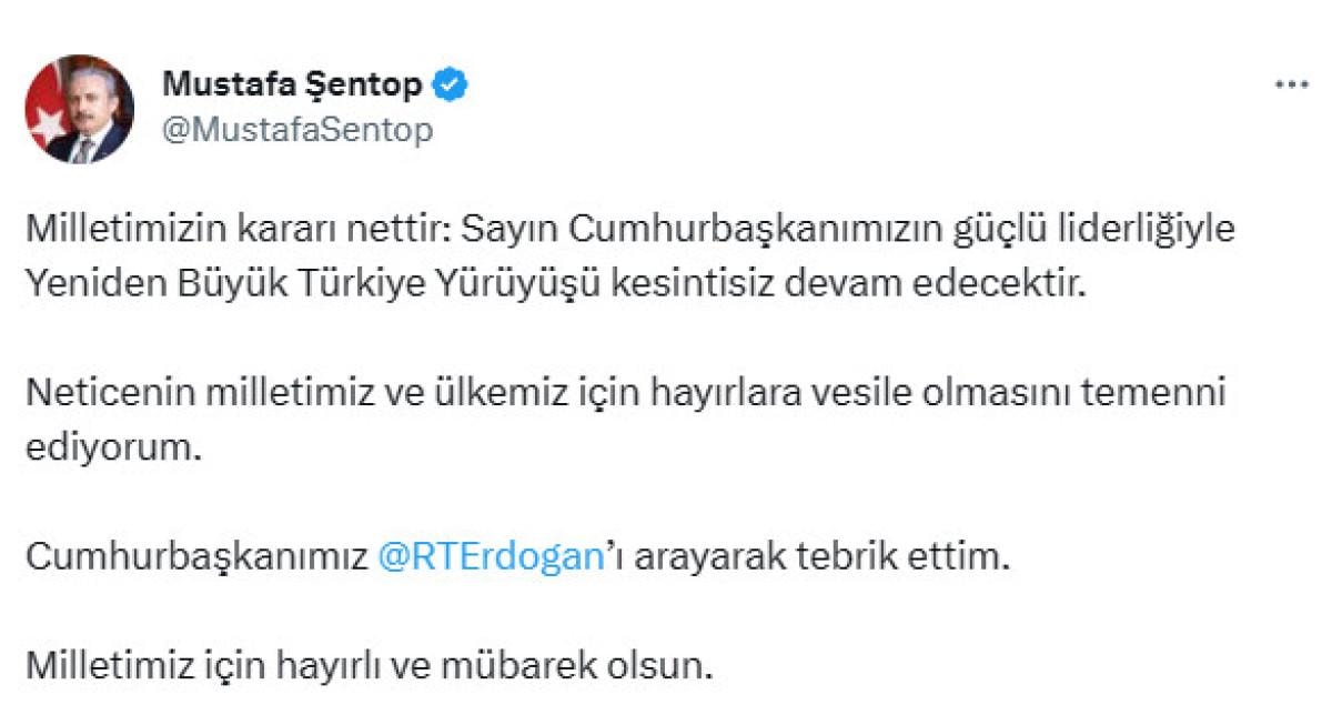 Cumhurbaşkanı Erdoğan'ı arayarak tebriklerini ileten Şentop, sosyal medya hesabından yaptığı paylaşımda şu ifadeleri kullandı: