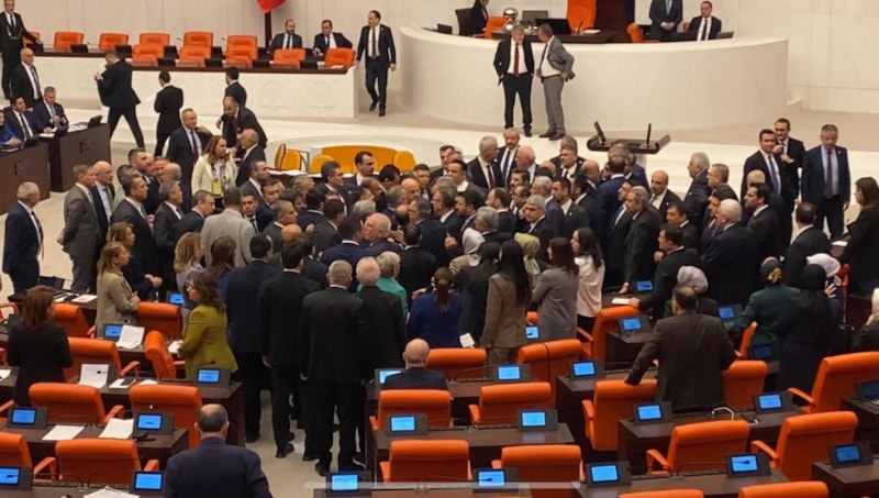 AK Parti grubundan başka milletvekillerinin de sataşması üzerine CHP Grup Başkanvekili Ali Mahir Başarır kolonya şişesi fırlattı, iki grup birbirlerinin üzerine yürüdü.