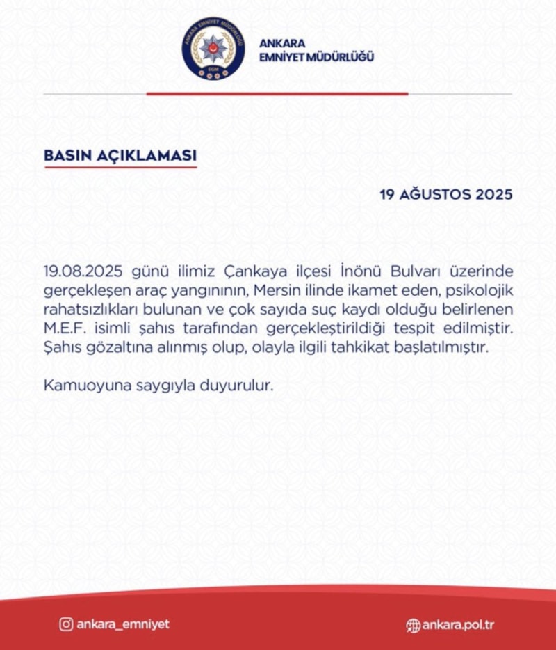 Konuya ilişkin açıklama yapan Ankara Emniyeti, aracı yakan kişinin Mersin'den geldiğini, psikolojik rahatsızlıkları bulunduğunu ve çok sayıda suç kaydı olduğunu açıkladı.