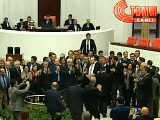 AK Parti milletvekilleri kürsü ile Başkanlık Divanı arasına geçerek, CHP'lileri kürsüden uzaklaştırmaya çalıştı. Bu sırada iki partinin milletvekilleri arasında yumruklaşmaya varan kavga ve itiş kakış yaşandı, bazı milletvekillerinin yaralandığı görüldü. Kavgaya karışan bazı milletvekilleri yere düştü.