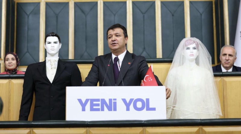 Saadet Partisi Genel Başkanı Mahmut Arıkan, TBMM Grup Toplantısı’na gelinlik ve damatlık giydirilmiş mankenlerle çıkarak gençlerin evlenememesine dikkat çekti. Arıkan, "Gençler seviyor ama ekonomik kriz yüzünden evlenemiyor" dedi.