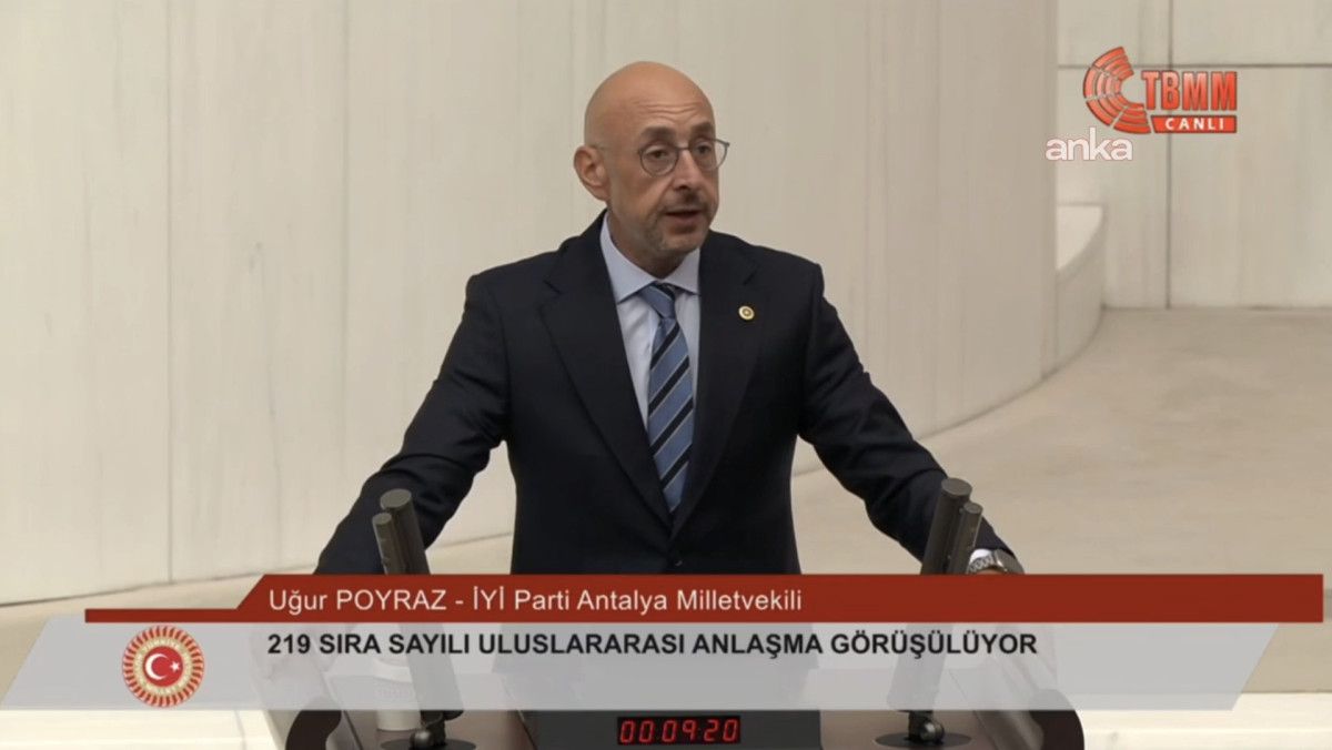 TBMM Genel Kurulu'nda konuşan İyi Parti Antalya Milletvekili Uğur Poyraz, "Bu delirmişliği ve bu cüreti ne iktidar partisine ne ortağına ne ana muhalefet partisine ne de olayın faili olan DEM Parti'ye yükleyerek partim ve şahsim adına bir siyasi istifade alanı yaratmaktan bile kaçınıyorum." vurgusu yaptı.
