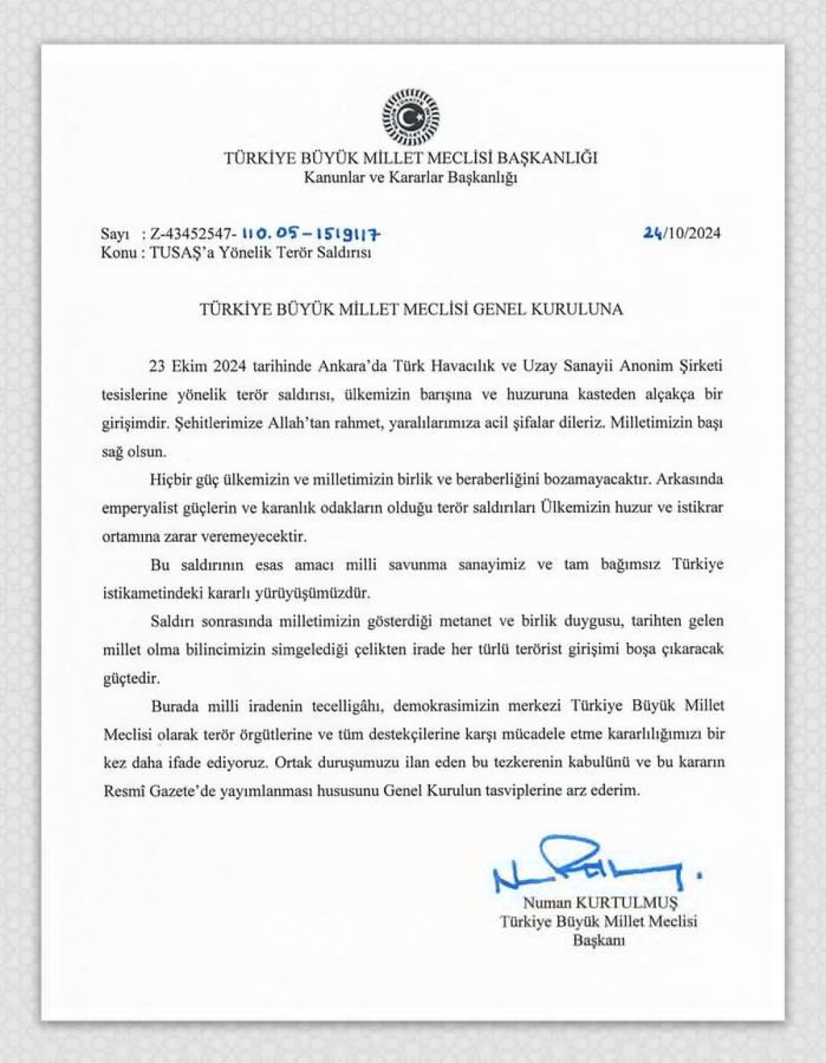 Türkiye Büyük Millet Meclisi Başkanı Numan Kurtulmuş'un imzasını taşıyan tezkerede şu ifadelere yer verildi: