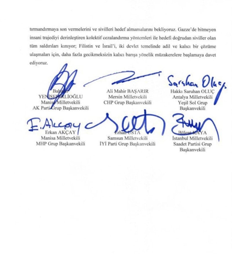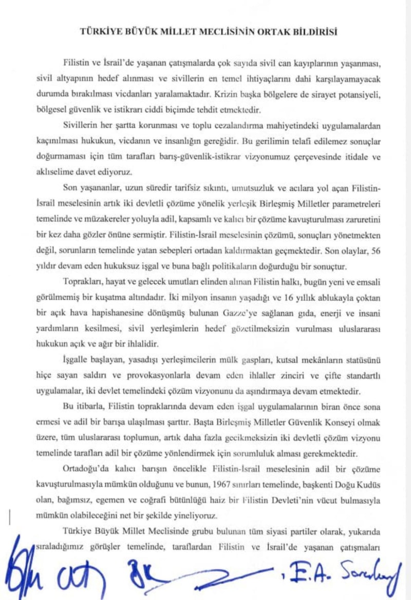 TBMM'de tüm siyasi partilerin imzasıyla Filistin ve İsrail'de yaşanan çatışmalara ilişkin yayınlanan ortak bildiride "Sivil yerleşim yerlerinin vurulması uluslararası hukukun ağır bir ihlalidir" denildi.