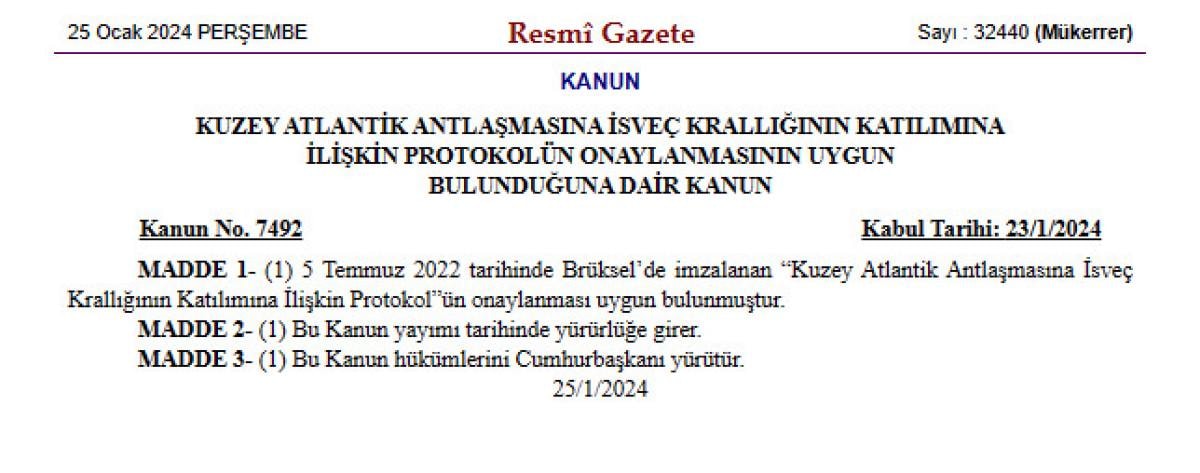 Cumhurbaşkanlığı İletişim Başkanlığının sosyal medya hesabından yapılan açıklamada, "Cumhurbaşkanımız Sayın Recep Tayyip Erdoğan, İsveç'in Kuzey Atlantik Antlaşması'na katılımına ilişkin Türkiye Büyük Millet Meclisince kabul edilen kanunun yayımlanmasına karar vermiş ve İsveç'in NATO'ya katılım protokolüne ilişkin Cumhurbaşkanı Kararını imzalayarak ilgili protokolü onaylamıştır." ifadelerine yer verildi.