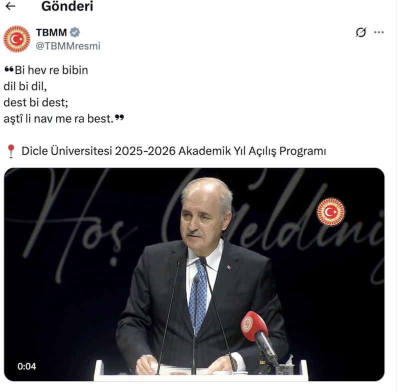 Numan Kurtulmuş'un Kürtçe söylediği sözler, TBMM'nin resmi X hesabı üzerinden paylaşıldı.
