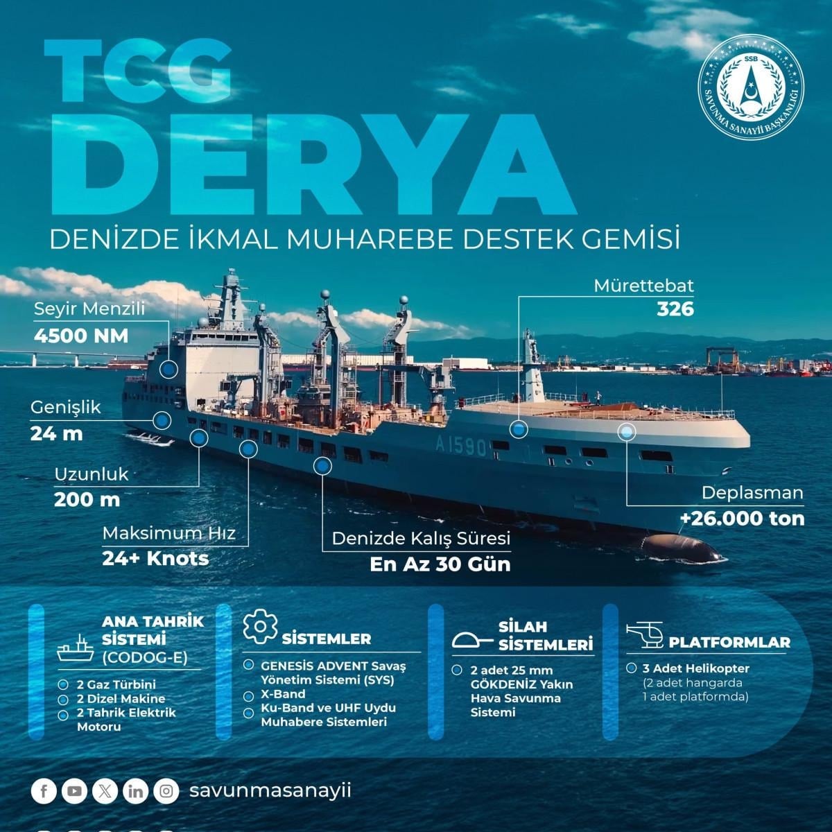 Denizde katı ve sıvı ikmal yapabilen TCG Derya gemisinin uzunluğu 194.8 metre, genişliği ise 24.4 metre.