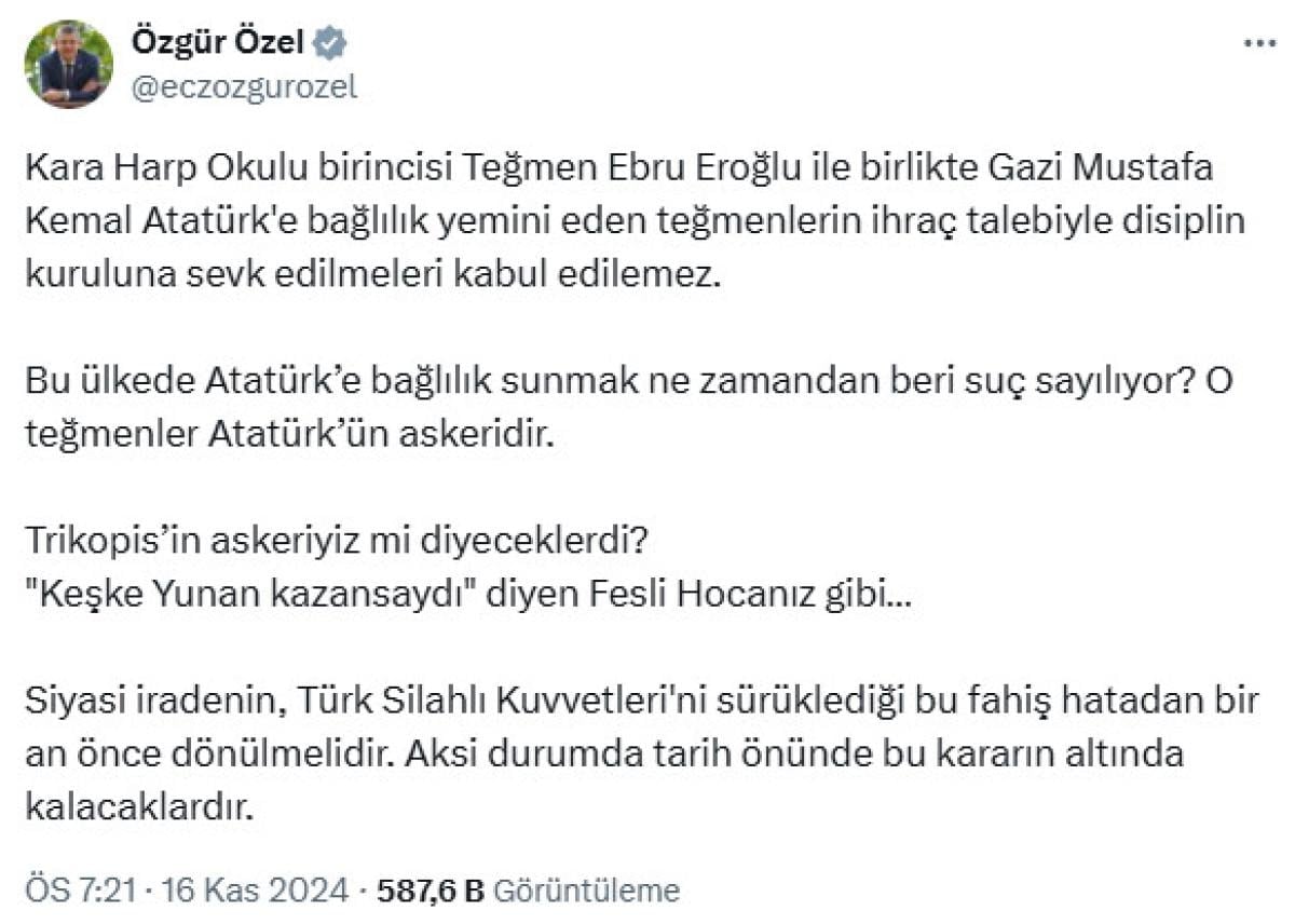 Konuyla ilgili açıklama yapan CHP Genel Başkanı Özgür Özel, teğmenlerin ihraç talebiyle disipline sevk edilmelerinin 'kabul edilemez' olduğunun altını çizdi.