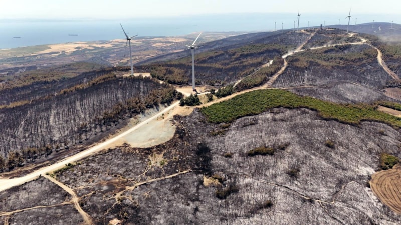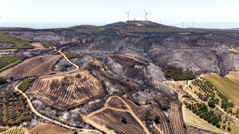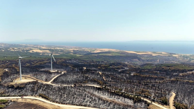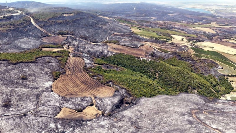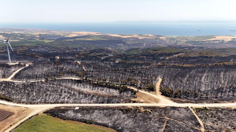 Tekirdağ’ın Şarköy ilçesinde 45,5 saat sonra kontrol altına alınan orman yangınında zarar gören alanlar havadan görüntülenirken, yangında, ormanın tamamen yanarak siyaha büründüğü görüldü.