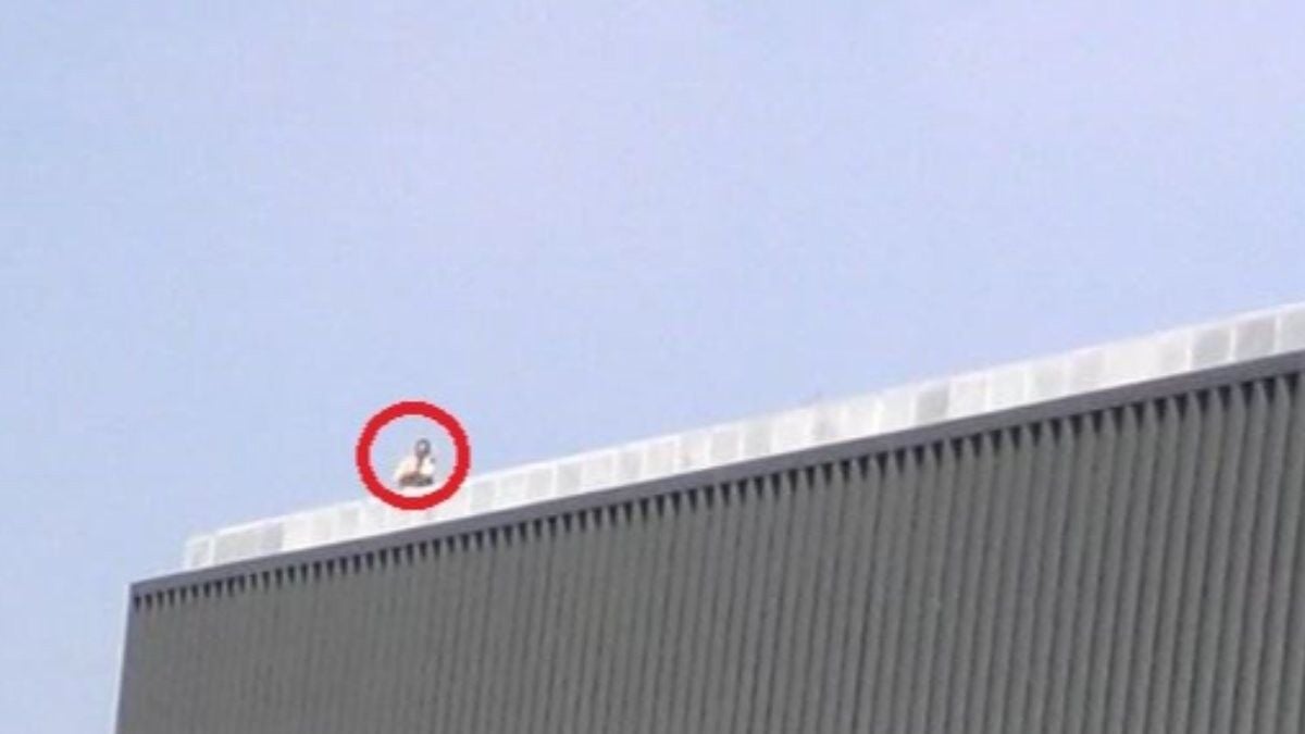 Kameralar tarafından görüntülendiğini fark eden drone kullanıcısı, çatıda kendini saklamaya çalıştı.