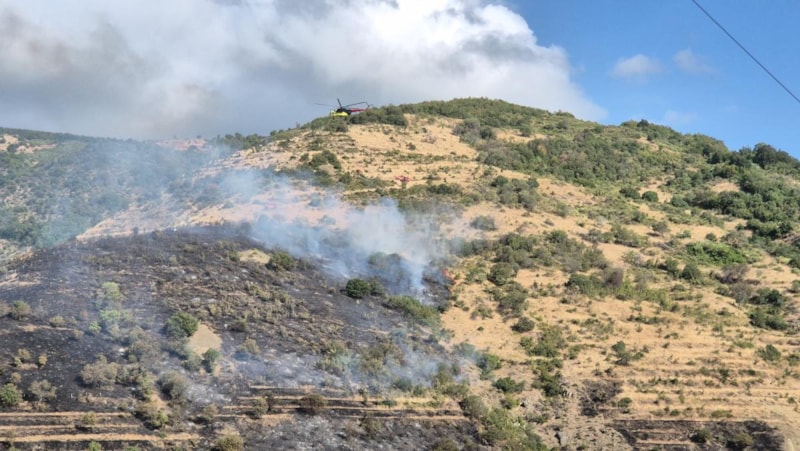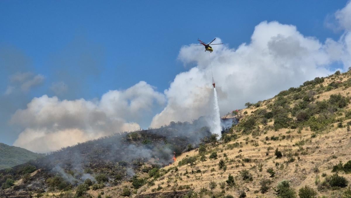 Ekipler, sarp arazi yapısı nedeniyle karadan müdahalenin güçlükle sürdüğü yangının çevredeki ormanlık alana sıçramaması için yoğun çaba sarf etti.