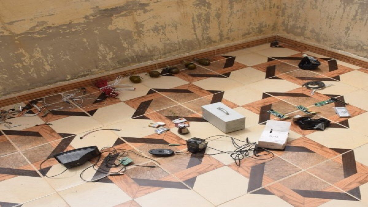 Gerekli önlemler alınarak evde yapılan aramalarda, 5 savunma tipi el bombası, 22 elektrikli kapsül, 28 kibrit başı eczası diye adlandırılan kapsül ateşleyicisi, elektrik güç ünitesi ve çok sayıda bilgisayar malzemesi ele geçirildi.