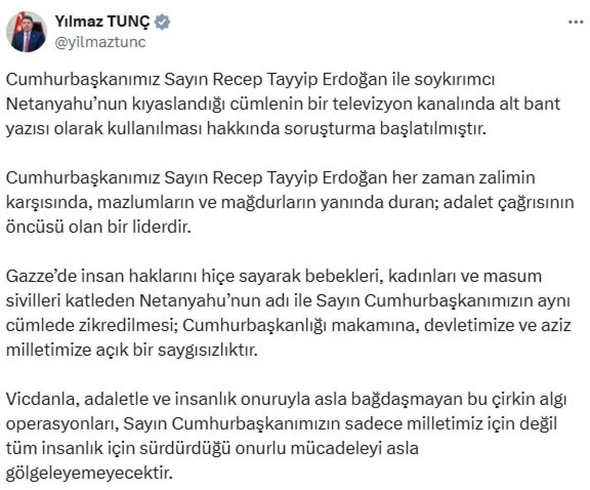 Adalet Bakanı Yılmaz Tunç, Cumhurbaşkanı Erdoğan ile soykırımcı Netanyahu’nun kıyaslandığı cümlenin bir televizyon kanalında alt bant yazısı olarak kullanılması hakkında soruşturma başlatıldığını duyurdu.
