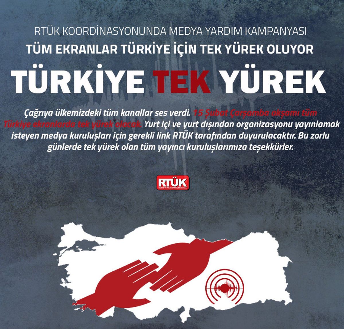 Organizasyonun yurt içinden ve yurt dışından yayınlanması için hazırlıklar son aşamada. Çarşamba akşamı saat 20.00’de ekranlar ve radyolar tek yürek olacak. RTÜK olarak medyamızın bu çok anlamlı ve ulvi dayanışmasını takdir ediyor ve yürekten destekliyoruz.