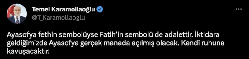 Saadet Partisi Genel Başkanı Temel Karamollaoğlu, sosyal medya hesabından paylaştığı gönderide, "İktidara geldiğimizde Ayasofya gerçek manada açılmış olacak. Kendi ruhuna kavuşacaktır" ifadelerini kullandı.