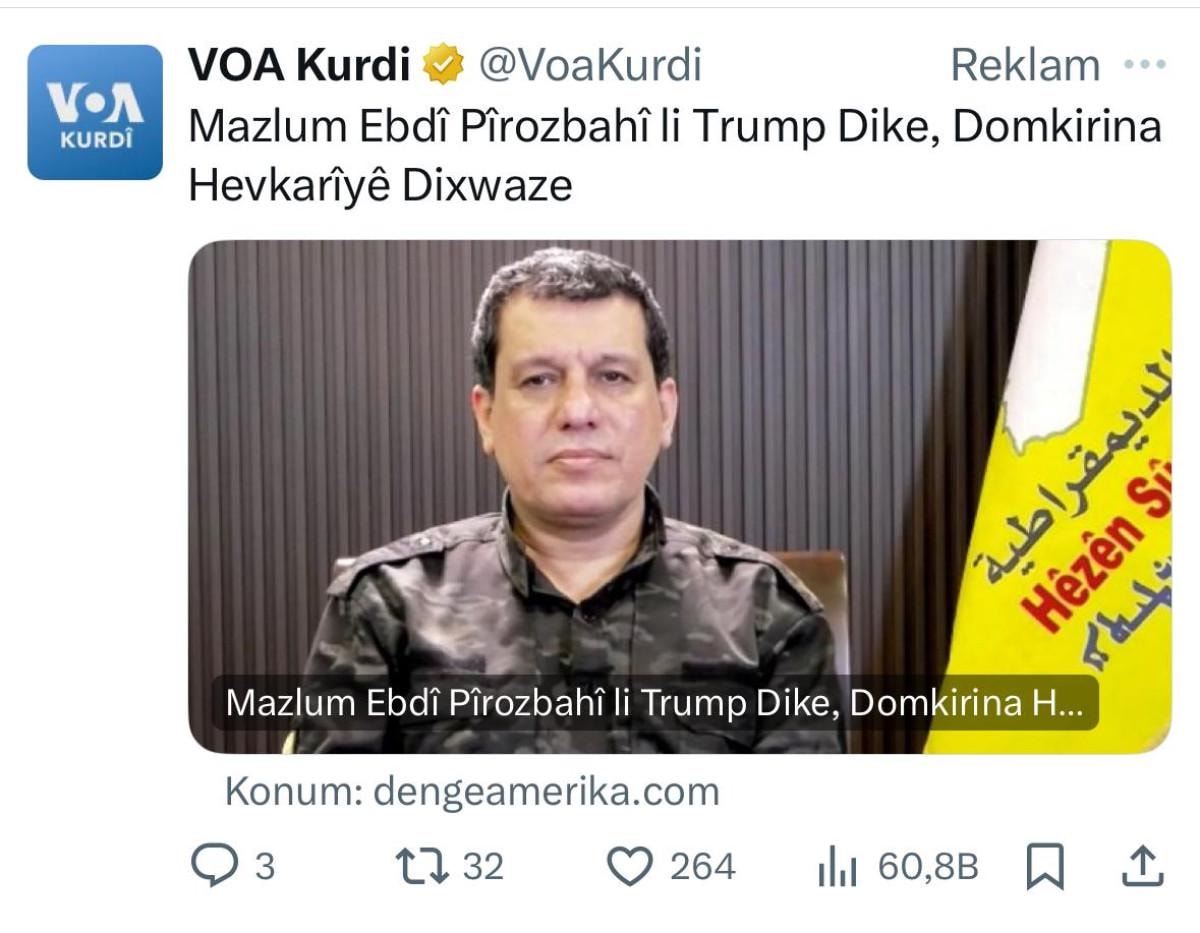 Bunun üzerine Kobani, kutlamasını duyurmak için ABD'li yayın organı olan VOA Kurdi X hesabı üzerinden reklam verdi.
