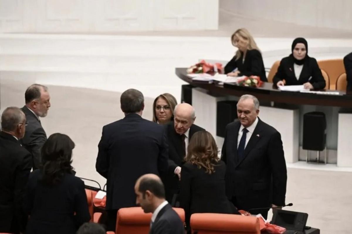Bahçeli'nin burada DEM Parti Eş Genel Başkanı Tuncer Bakırhan, DEM Parti Grup Başkanvekili Sezai Temelli, DEM Parti Van Milletvekili Pervin Buldan ve DEM Parti Ağrı Milletvekili Sırrı Sakık'ın da aralarında bulunduğu isimlerle tokalaşma anları kameralara yansıdı.