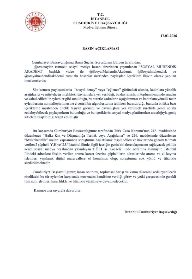Soruşturmada "Sosyal deney” adı altında paylaşılan videolarda kadınlara yönelik aşağılayıcı ve müstehcen davranışlara yer verildiği, bu içeriklerin tacizi normalleştirebilecek nitelikte olduğu ve genel ahlakı zedeleyebileceği tespit edildi.
