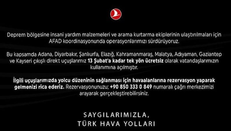 Bu kapsamda Adana, Diyarbakır, Şanlıurfa, Elazığ, Kahramanmaraş, Malatya, Adıyaman, Gaziantep ve Kayseri çıkışlı direkt uçuşlarımız 13 Şubat'a kadar tek yön ücretsiz olarak vatandaşlarımızın kullanımına açılmıştır.