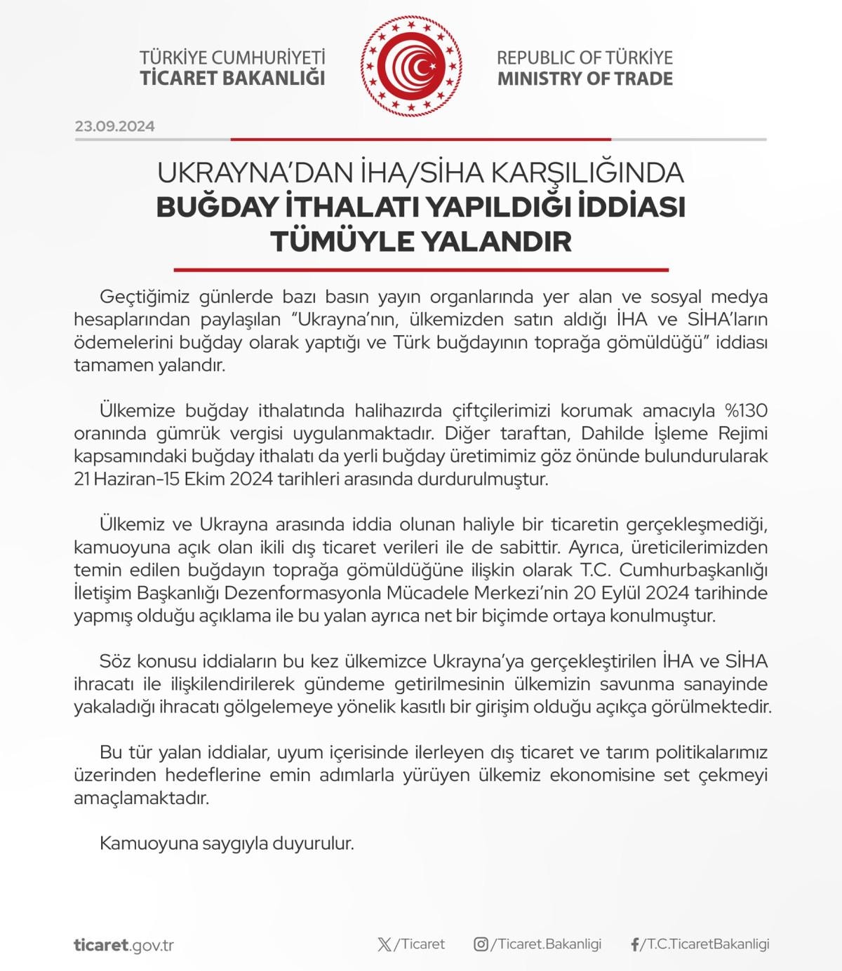 Ticaret Bakanlığı, Ukrayna’dan İHA/SİHA karşılığında buğday ithalatı yapıldığı ve Türk buğdayının toprağa gömüldüğü iddiaları üzerine harekete geçti.