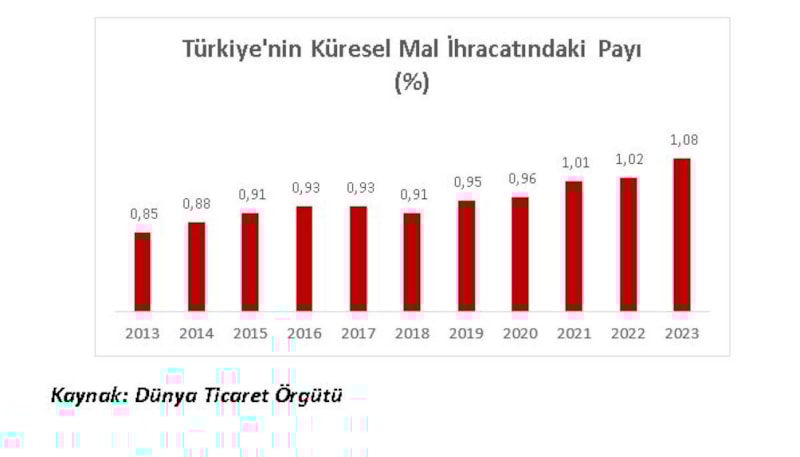 Türkiye’nin dünya ihracatındaki payı 2022’de yüzde 1,02’den 2023 sonunda yüzde 1,08’e yükselme başarısı kaydetti. Açıklama ise Ticaret Bakanlığı'ndan geldi.
