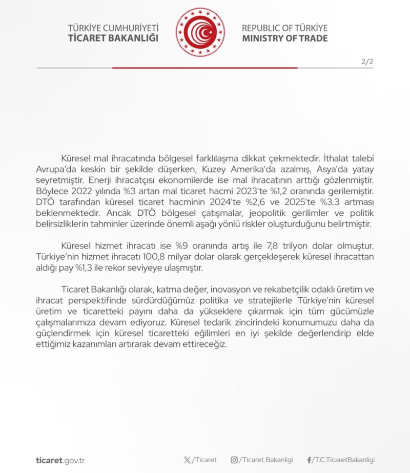 Türkiye'nin hizmet ihracatı 100,8 milyar dolar olarak gerçekleşerek küresel ihracattan aldığı pay yüzde 1,3 ile rekor seviyeye ulaşmıştır. Ticaret Bakanlığı olarak, katma değer, inovasyon ve rekabetçilik odaklı üretim ve ihracat perspektifinde sürdürdüğümüz politika ve stratejilerle Türkiye'nin küresel üretim ve ticaretteki payını daha da yükseklere çıkarmak için tüm gücümüzle çalışmalarımıza devam ediyoruz.