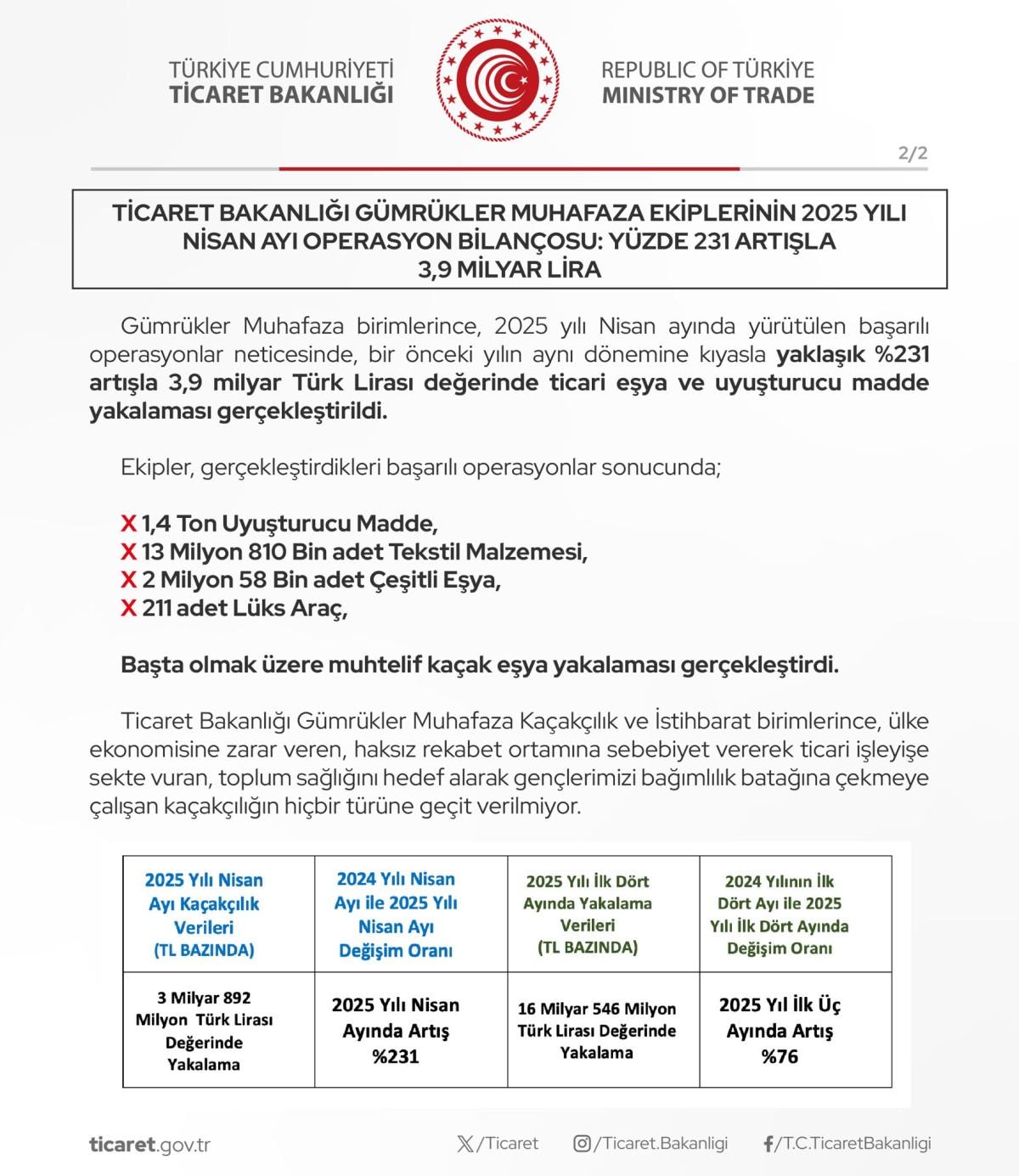Ekiplerin çalışması sonucu nisan ayında, bir önceki yıla kıyasla operasyonlar yüzde 231 arttı ve 3.9 milyar TL'lik ticari eşya ve uyuşturucu madde yakalandı. Yakalananlar ise şöyle: