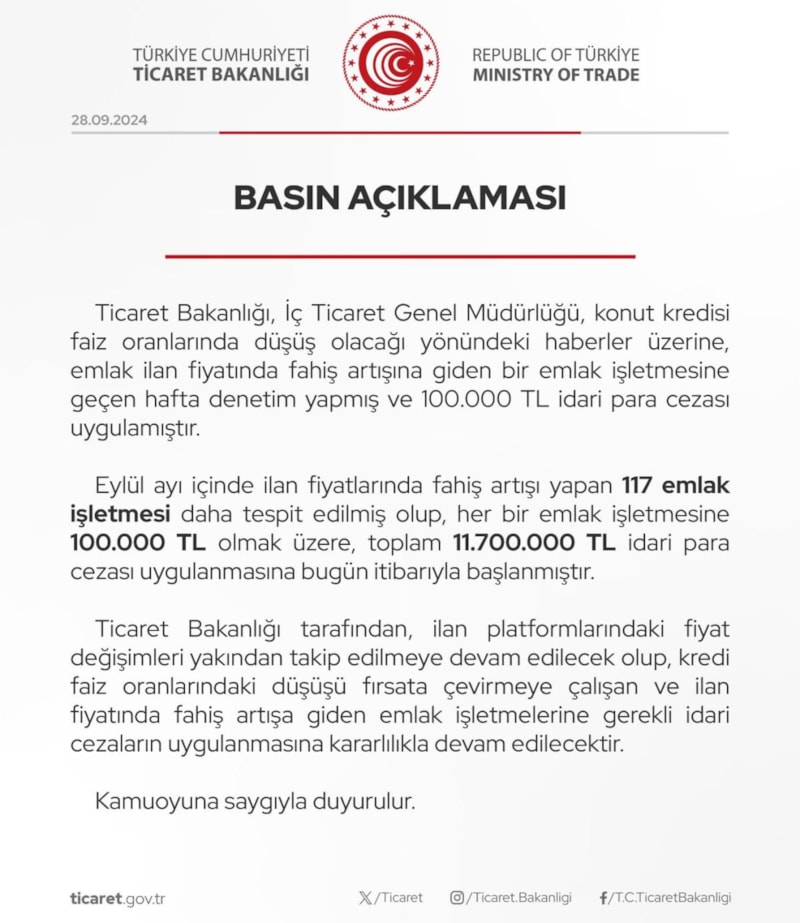 Eylül ayı içinde ilan fiyatlarında fahiş artış yapan 117 emlak işletmesi daha tespit edilmiş olup, her bir emlak işletmesine 100 bin lira olmak üzere toplam 11 milyon 700 bin lira idari para cezası uygulanmasına bugün itibarıyla başlanmıştır.