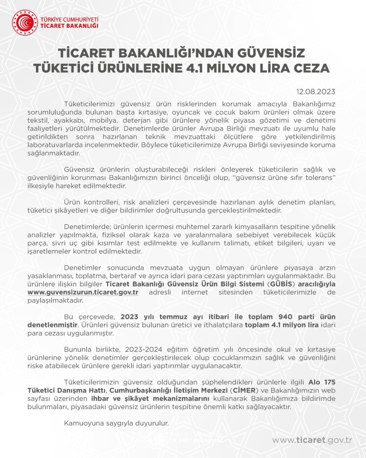 Bu çerçevede, 2023 yılı temmuz ayı itibari ile toplam 940 parti ürün denetlenmiştir. Ürünleri güvensiz bulunan üretici ve ithalatçılara toplam 4.1 milyon lira idari para cezası uygulanmıştır. Bununla birlikte, 2023-2024 eğitim öğretim yılı öncesinde okul ve kırtasiye ürünlerine yönelik denetimler gerçekleştirilecek olup çocuklarımızın sağlık ve güvenliğini riske atabilecek ürünlere gerekli idari yaptırımlar uygulanacaktır.