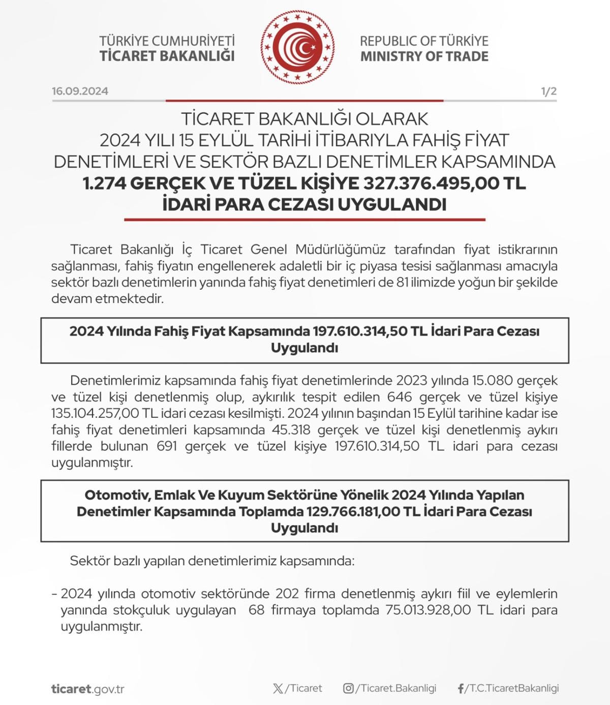 Ticaret Bakanlığı olarak 2024 yılında 15 Eylül tarihine kadar sektör bazlı denetimler ve fahiş fiyat denetimleri toplamında 46 bin 368 gerçek ve tüzel kişi denetlenerek aykırı eylem ve fillerle birlikte, stokçuluk girişimlerinde bulunan 1274 gerçek ve tüzel kişiye 327 milyon 376 bin 495,50 TL idari para cezası uygulanmıştır." ifadelerine yer verildi.