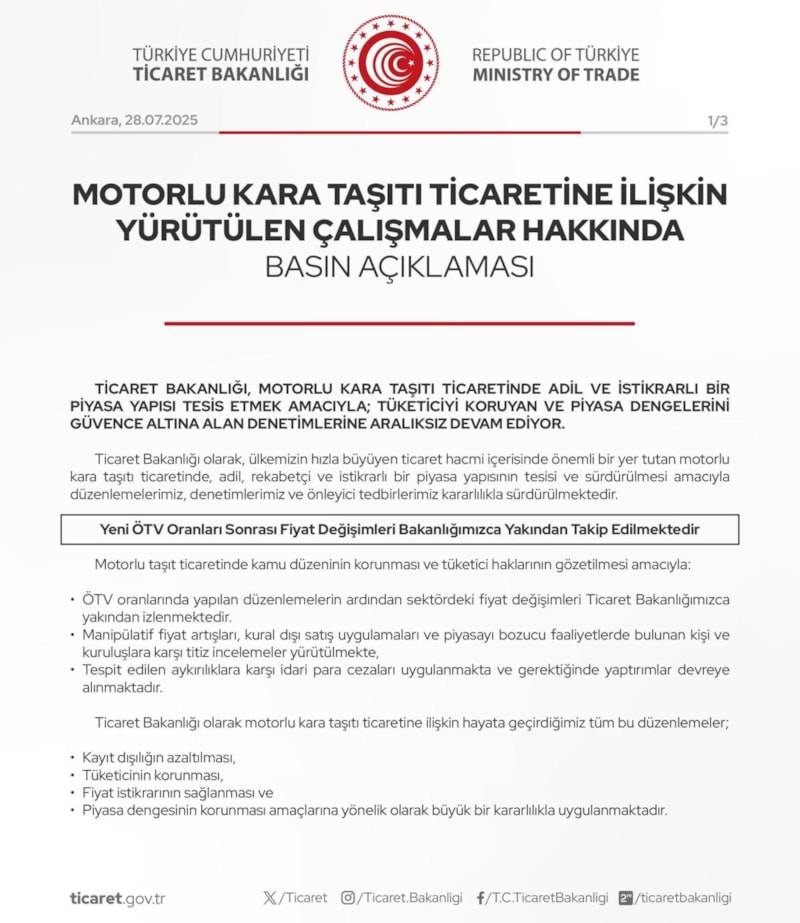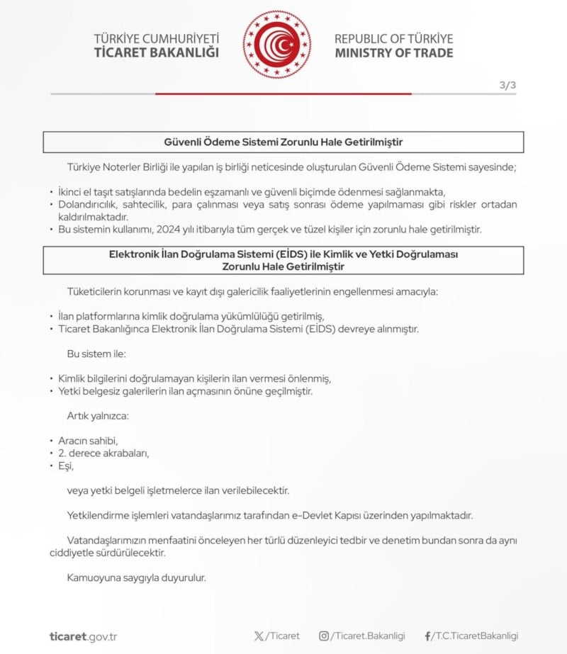 Ticaret Bakanlığı, araç ticaretine ilişkin bu düzenleme ve denetimlerin aynı kararlılıkla devam edeceğini ve vatandaşın lehine olan tüm tedbirlerin tavizsiz şekilde uygulanacağını vurguladı.