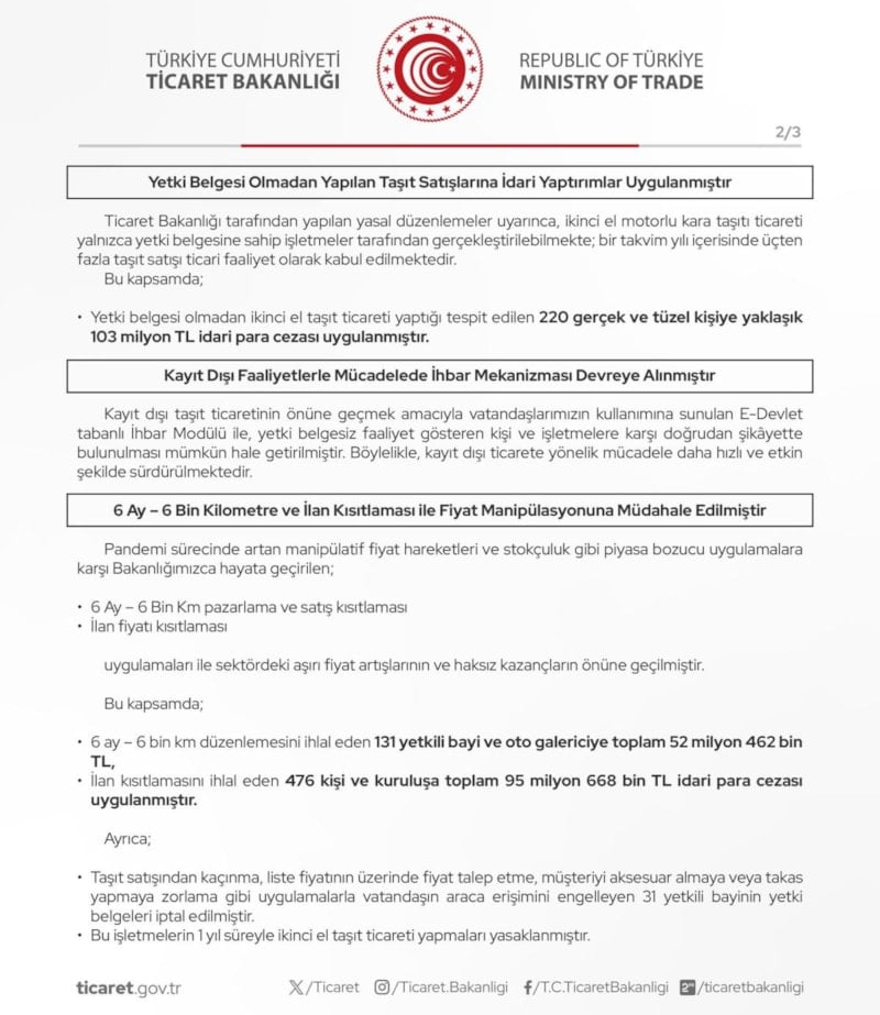 Bu kapsamda, kuralı ihlal eden 131 yetkili bayi ve oto galericiye toplam 52 milyon 462 bin TL, ilan kısıtlamasına uymayan 476 kişi ve kuruluşa ise 95 milyon 668 bin TL idari para cezası kesildi.