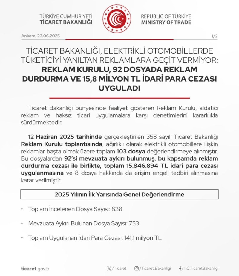 Kurulun, 12 Haziran'daki toplantısında elektrikli otomobiller başta olmak üzere 103 dosya değerlendirildiği belirtilen açıklamada, "Bunlardan 92'si, mevzuata aykırı bulundu. Reklam durdurma cezasıyla birlikte 15 milyon 846 bin 894 lira idari para cezası uygulanmasına ve 8 dosya hakkında da erişim engeli tedbiri alınmasına karar verildi. Elektrikli otomobil reklamlarında bazı üretici ve satıcıların, araçların menzil bilgilerini laboratuvar koşullarında elde edilen WLTP verileri ile sunduğu, bu bilgileri gerçek kullanım koşullarını yansıtmadan, yanıltıcı biçimde tanıttığı tespit edildi." ifadeleri kullanıldı.