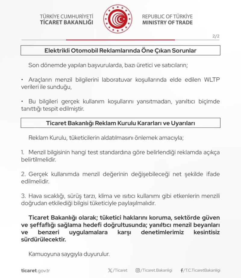 Açıklamada, Bakanlık olarak tüketici haklarını koruma, sektörde güven ve şeffaflığı sağlama hedefi doğrultusunda, yanıltıcı menzil beyanları ve benzeri uygulamalara karşı denetimlerin kesintisiz sürdürüleceği de vurgulandı.