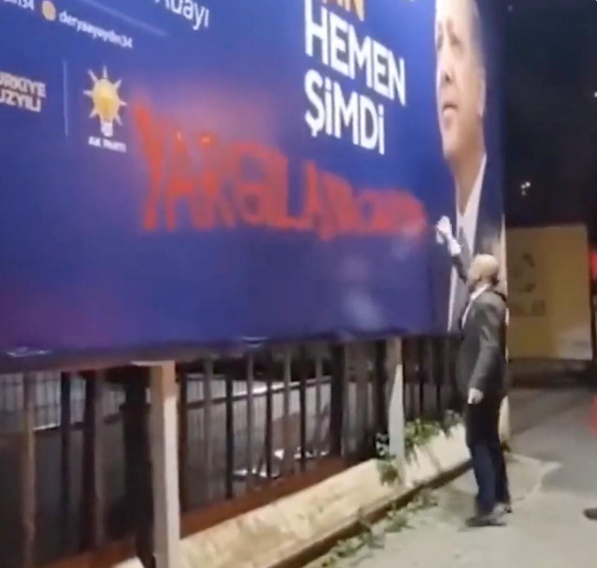 Geçtiğimiz yasama yılında HDP listelerinden Meclis'e giren Türkiye İşçi Partili (TİP) Ahmet Şık, Cumhurbaşkanı Erdoğan'ın fotoğrafının bulunduğu AK Parti reklam afişlerine sprey boya ile yazı yazdı.