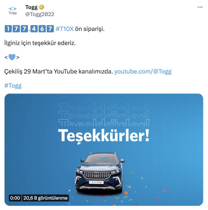 Bunun üzerine Togg, çekilişle teslim edilecek T10X adedini 12 binden 20 bine çıkardığını açıkladı.