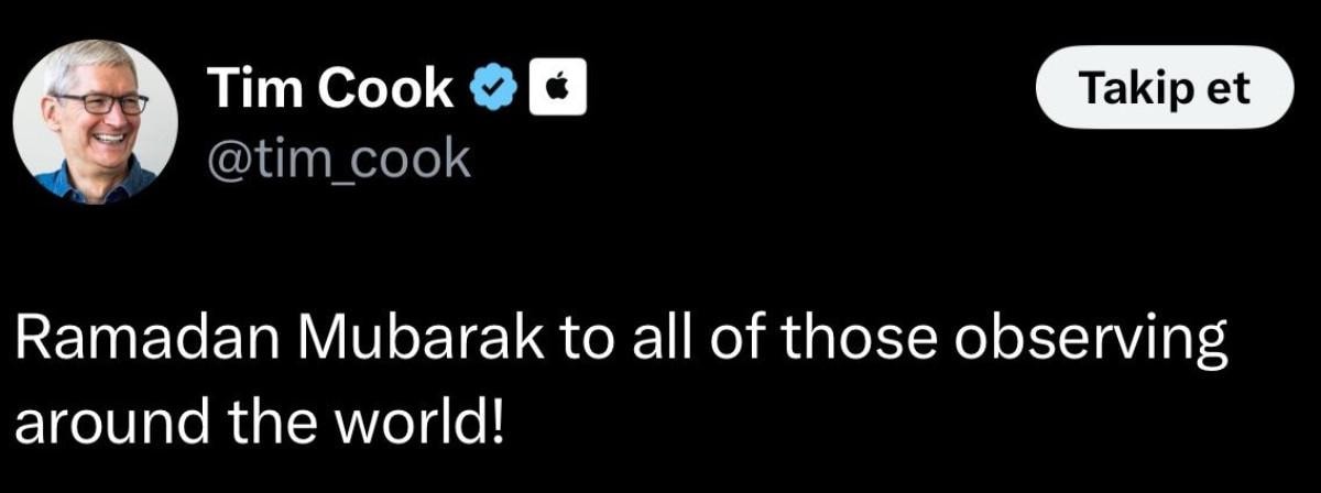 Dünyanın en büyük teknoloji şirketlerinden biri olan Apple’ın CEO’su Tim Cook, Ramazan ayının başlaması dolayısıyla Müslüman topluluklara hitaben bir mesaj yayımladı. Cook, sosyal medya hesabından yaptığı paylaşımda, “Dünya genelinde oruç tutan herkesin Ramazan ayı mübarek olsun!” ifadelerini kullanarak, bu özel aya duyduğu saygıyı dile getirdi.