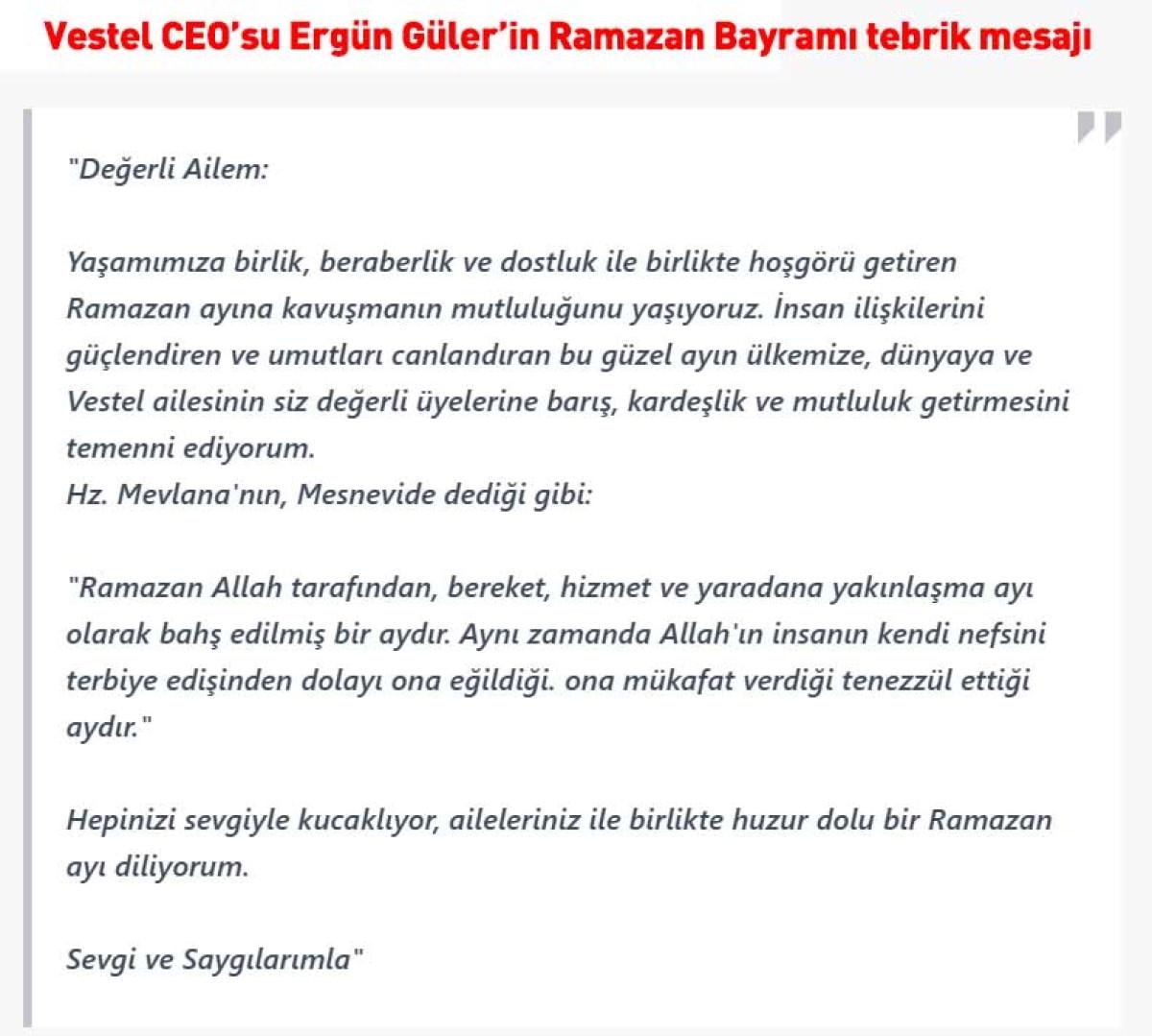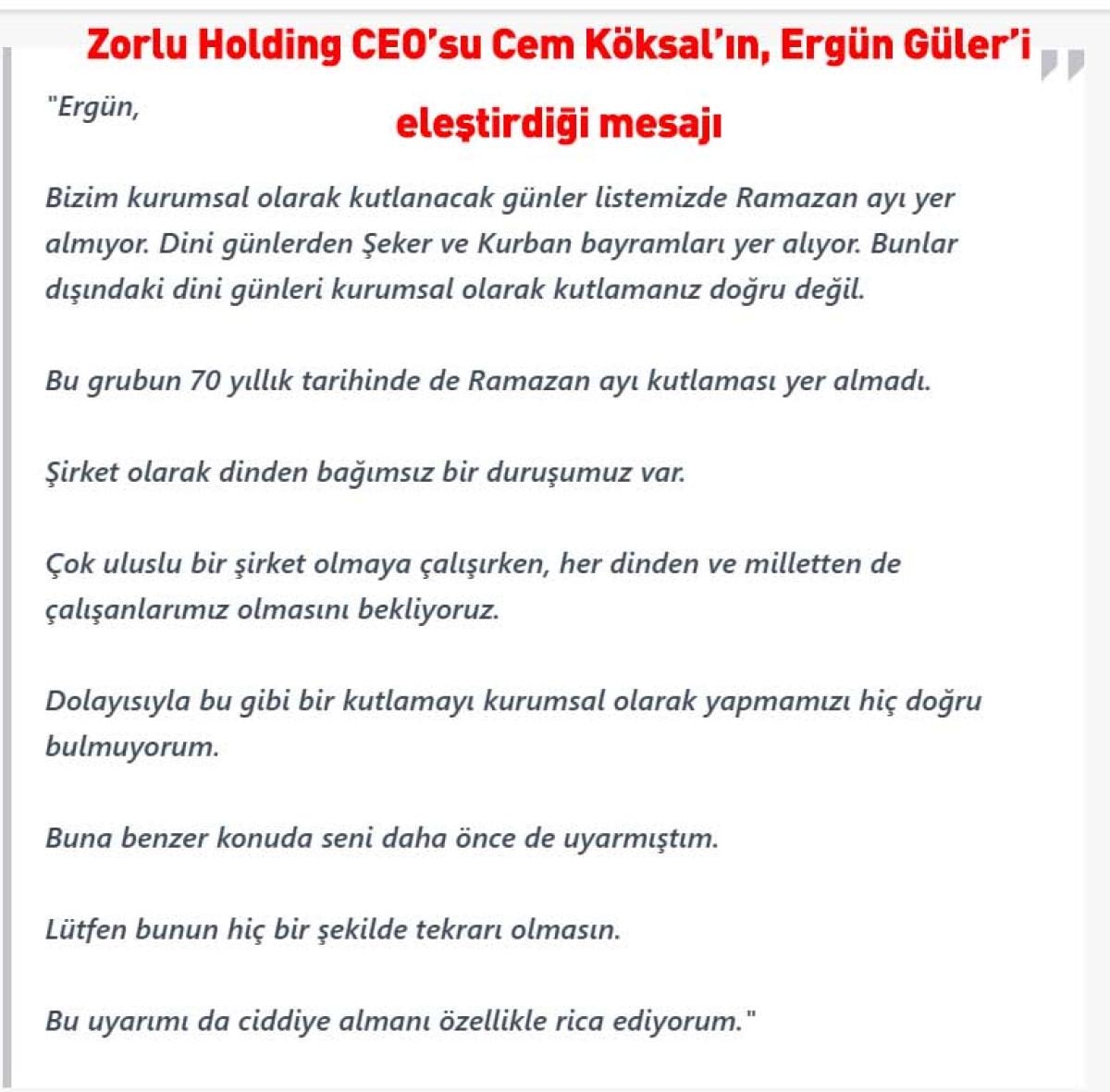 Vestel CEO’su Ergün Güler, çalışanlarına hitaben yazdığı mesajında, “Değerli ailem” diyerek başladığı ifadelerini, “Hepinizi sevgiyle kucaklıyor, aileleriniz ile birlikte huzur dolu bir Ramazan ayı diliyorum” sözleriyle tamamladı. Ancak, Zorlu Holding’in üst düzey yöneticisi Cem Köksal, bu kutlama mesajına karşılık olarak tüm çalışanların görebileceği şekilde yaptığı paylaşımda, "Bu grubun 70 yıllık tarihinde Ramazan ayı kutlaması yer almadı. Şirket olarak dinden bağımsız bir duruşumuz var." ifadelerini kullandı.