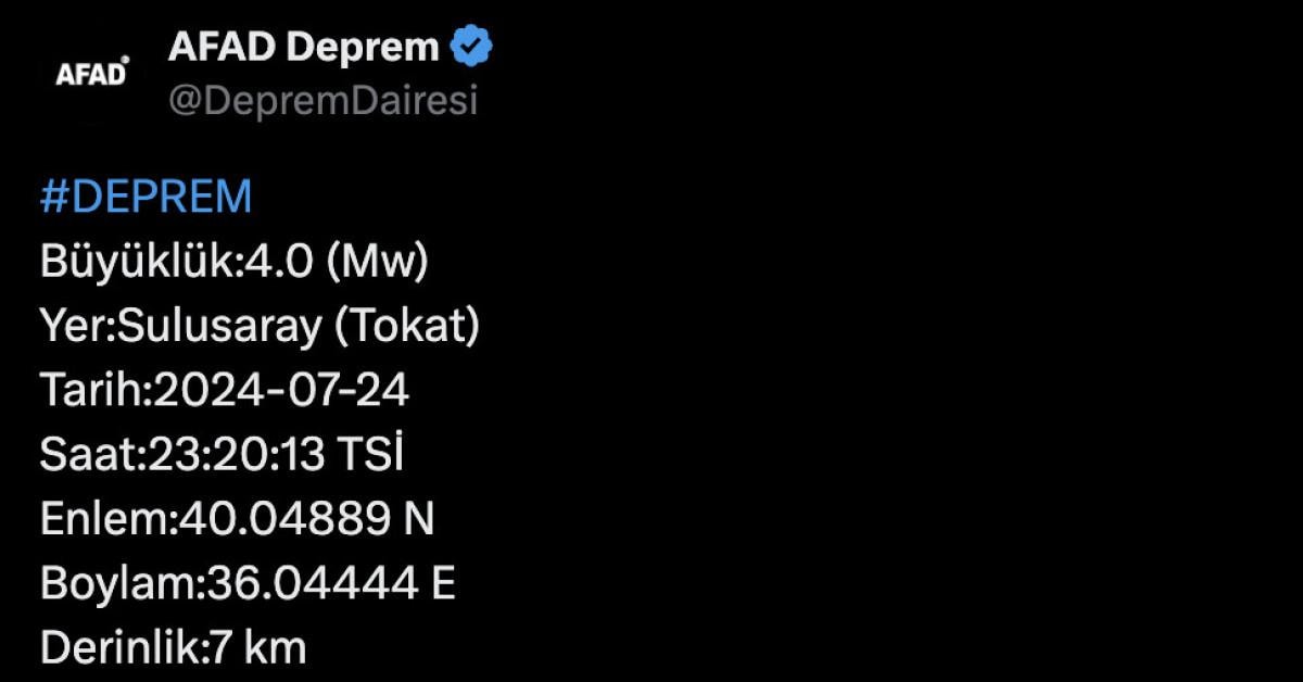 Afet ve Acil Durum Yönetimi Başkanlığı'nın açıklamasına göre Tokat'ın Sulusaray ilçesinde saat 23.20'de 4 büyüklüğünde bir sarsıntı yaşandı.
