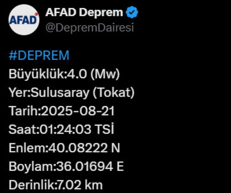 AFAD'dan yapılan açıklamalara göre Tokat'ın Sulusaray ilçesinde saat 01.24'te 4 büyüklüğünde deprem oldu.